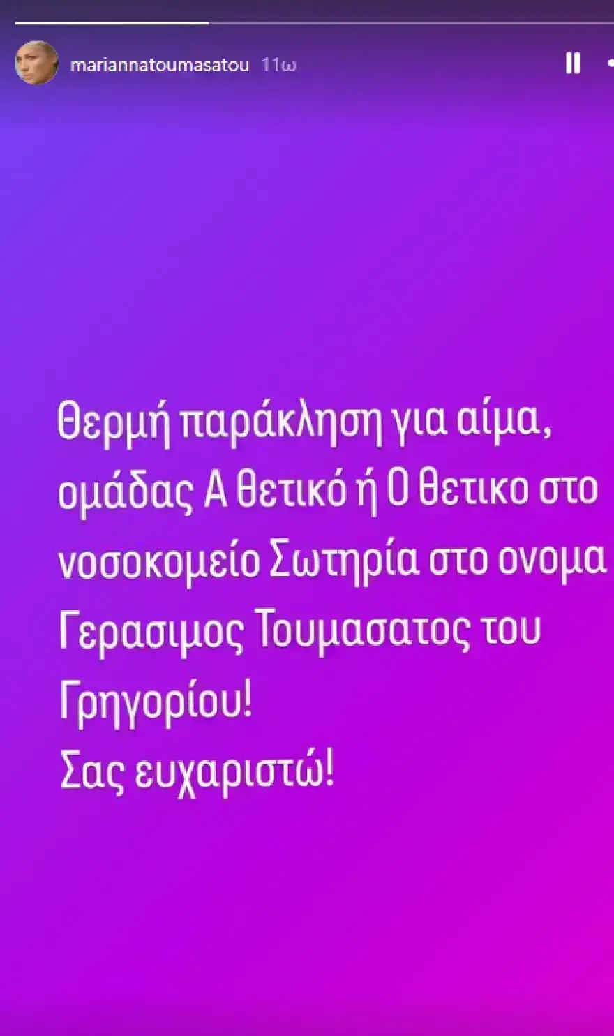 «Θερμή παράκληση για αίμα ομάδας Α Θετικό ή 0 θετικό στο νοσοκομείο Σωτηρία στο όνομα Γεράσιμος Τουμασάτος του Γρηγορίου. Σας ευχαριστώ!».