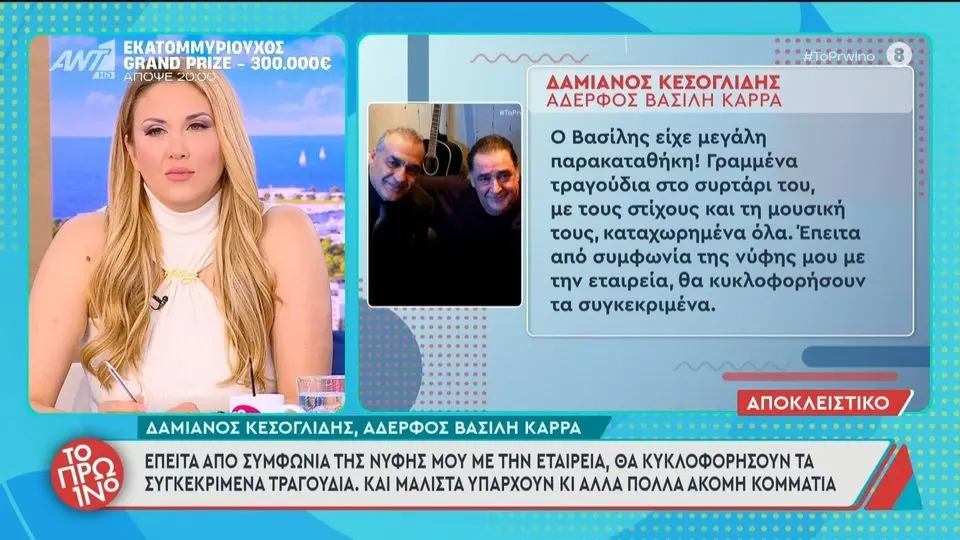 Μιλώντας στην εκπομπή «Το Πρωινό» την Παρασκευή 27 Φεβρουαρίου, περιέγραψε την επιμέλεια με την οποία ο καλλιτέχνης διατηρούσε το αρχείο του. Όπως ανέφερε, υπήρχε σημαντικός αριθμός τραγουδιών καταγεγραμμένων με στίχους και μουσική, πλήρως οργανωμένων. Παράλληλα, τόνισε ότι υπάρχουν και άλλα ανέκδοτα κομμάτια, αφήνοντας ανοιχτό το ενδεχόμενο νέων κυκλοφοριών στο μέλλον.