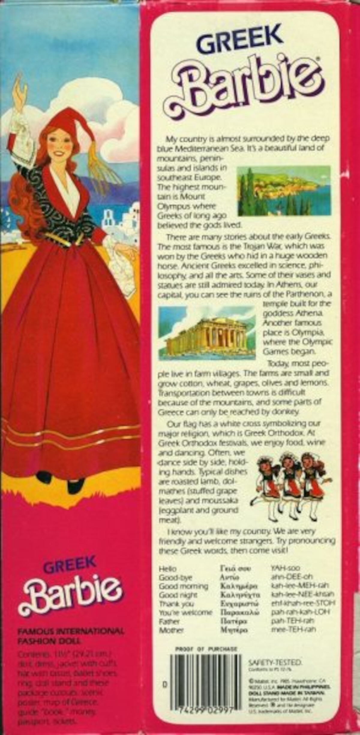 Η συσκευασία περιείχε περιγραφή της Ελλάδας στο οποίο αναφερόταν πως τότε οι περισσότεροι άνθρωποι ζούσαν σε χωριά. Ο δημιουργός της Barbie έγραφε για την Αρχαία Ελλάδα, την ελληνική σημαία αλλά και τα… πανηγύρια.