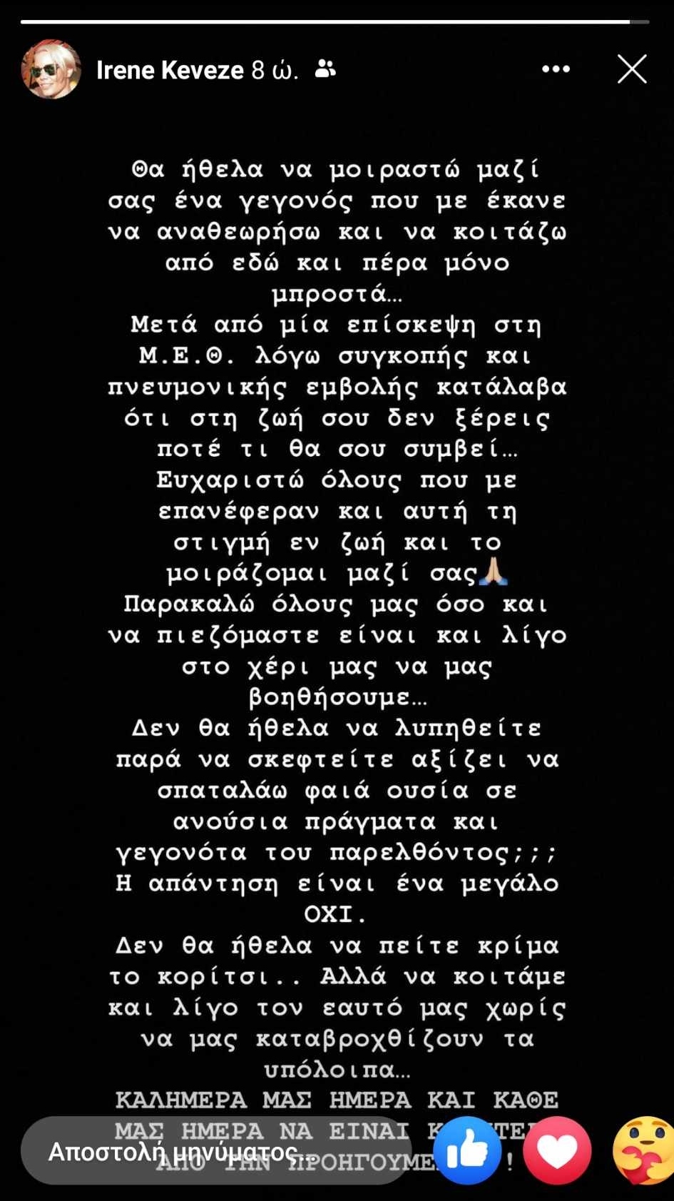 Όπως αναφέρει και η ίδια στην ανάρτηση που ακολουθεί, η Ειρήνη Κεβεζέ εισήχθη εκτάκτως στη ΜΕΘ καθώς έπαθε συγκοπή και πνευμονική εμβολή.