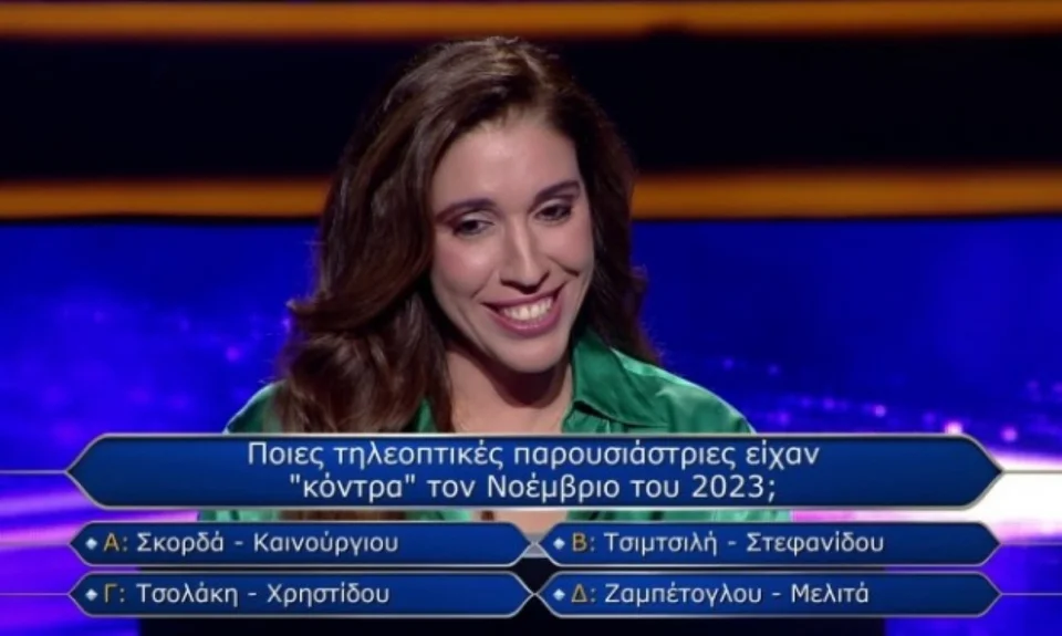 Συγκεκριμένα, η παίκτρια του «Εκατομμυριούχου» κλήθηκε να απαντήσει στην εξής ερώτηση: «Ποιες τηλεοπτικές παρουσιάστριες είχαν “κόντρα” τον Νοέμβριο του 2023;». Τα ζευγάρια ανάμεσα στα οποία είχε να επιλέξει η παίκτρια ήταν τα Σκορδά-Καινούργιου, Τσιμτσιλή-Στεφανίδου, Τσολάκη-Χριστίδου και Ζαμπέτογλου-Μελιτά.