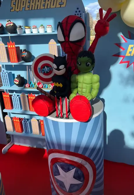 Η διακόσμηση κινήθηκε σε θεματική υπερηρώων, με εντυπωσιακά μπαλόνια και τούρτα στο ίδιο ύφος, δημιουργώντας έναν χώρο γεμάτο χρώμα και παιδική φαντασία.