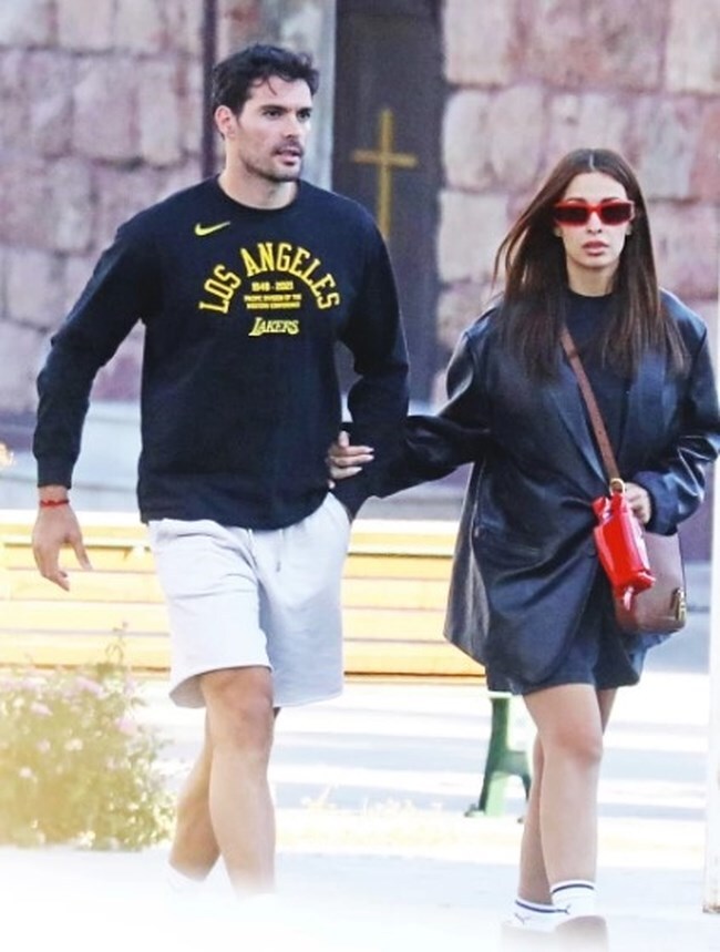 Στην παρακάτω φωτογραφία, όπου απεικονίζεται ο Αλμπέρτο Μποτία και η Ελένη Φουρέιρα, η τραγουδίστρια φροντίζει επιμελώς να κρύψει την κοιλιά της, με το μακρύ δερμάτινο σακάκι της.