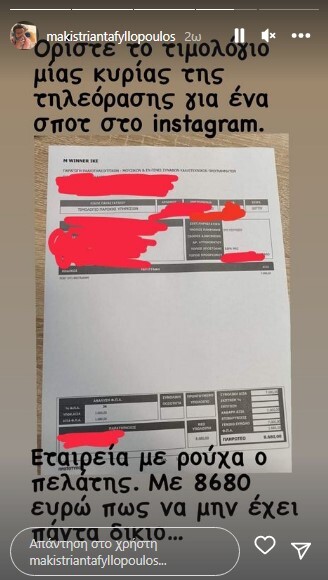 Ο γνωστός δημοσιογράφος απέκρυψε το όνομα της παρουσιάστριας, σχολιάζοντας «ορίστε το τιμολόγιο μίας κυρίας της τηλεόρασης για ένα σποτ στο instagram. εταιρία με ρούχα ο πελάτης. Με 8680 ευρώ πώς να μην έχει πάντα δίκιο», ωστόσο δεν έκρυψε την επωνυμία της επιχείρησης στην κορυφή του εγγράφου.
