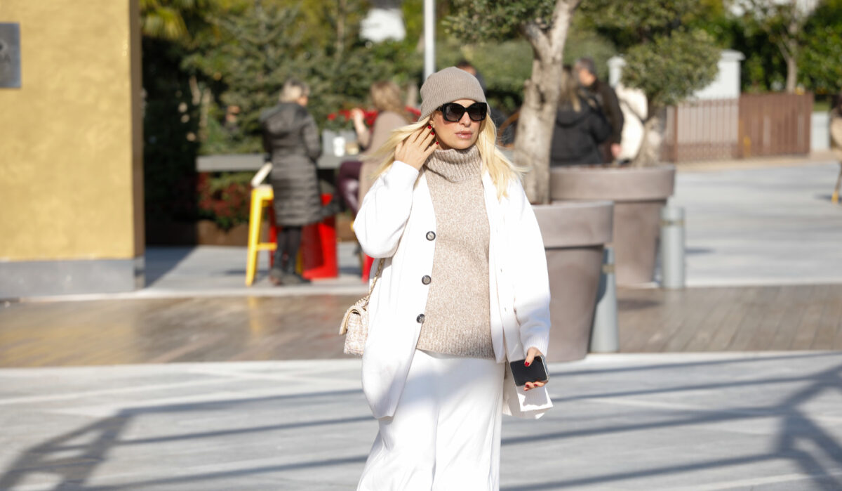 Φορώντας ένα loose παντελόνι, λευκή ζακέτα και ένα πουλόβερ, ολοκλήρωσε το σύνολο με φλατ μποτάκια και σκουφάκι στα μαλλιά.