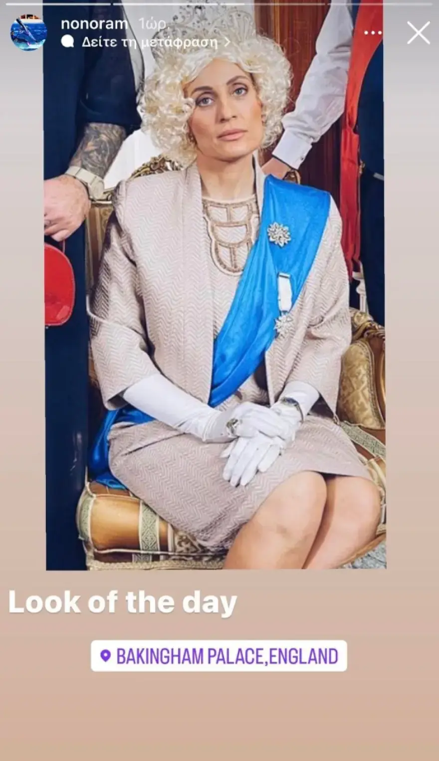 Στη φωτογραφία που δημοσίευσε σε story, η παρουσιάστρια φαίνεται ντυμένη σαν τη… βασίλισσα Καμίλα, ενώ φορά περούκα και στέμμα.
