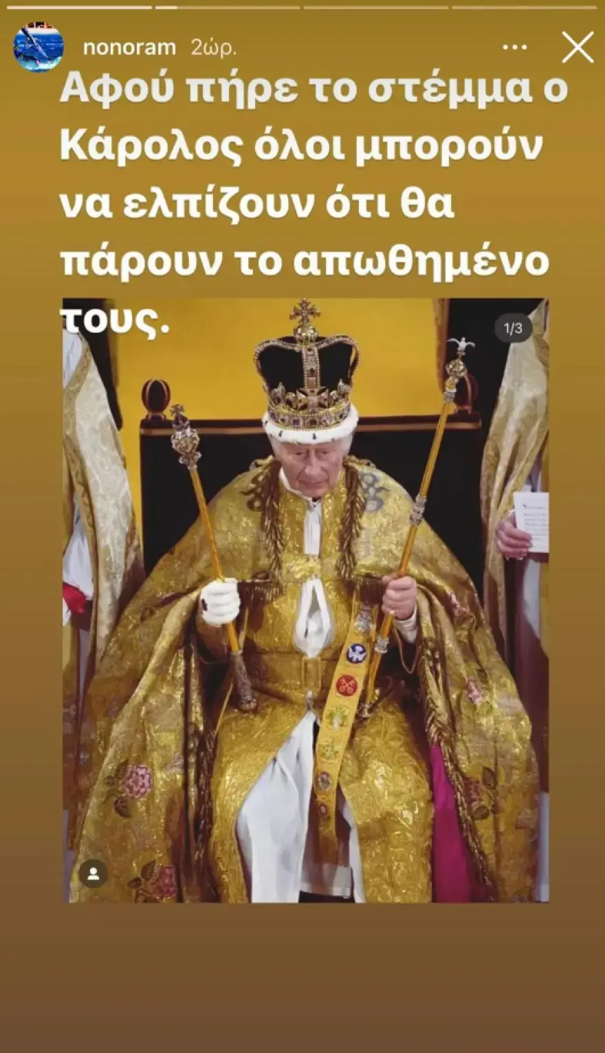 Σε ένα δεύτερο story που ανάρτησε, με τη φωτογραφία του βασιλιά Καρόλου, έγραψε: «Αφού πήρε το στέμμα ο Κάρολος, όλοι μπορούν να ελπίζουν ότι θα πάρουν το απωθημένο τους».