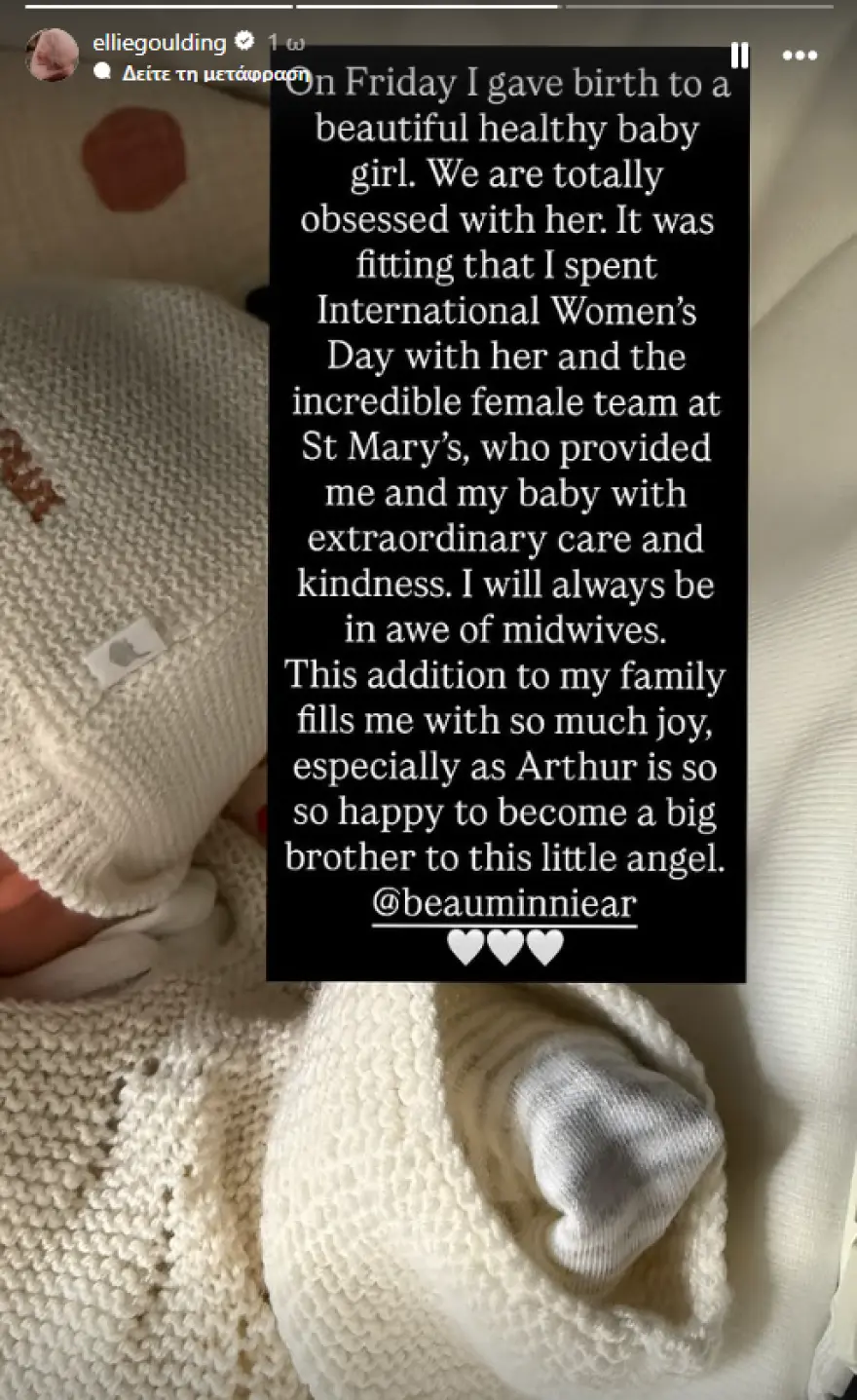 Και τόνισε ότι ο γιος της ανυπομονεί για τον νέο του ρόλο: «Αυτή η προσθήκη στην οικογένειά μου με γεμίζει τόση χαρά, ειδικά καθώς ο Άρθουρ είναι τόσο χαρούμενος που γίνεται μεγάλος αδελφός για αυτόν τον μικρό άγγελο».