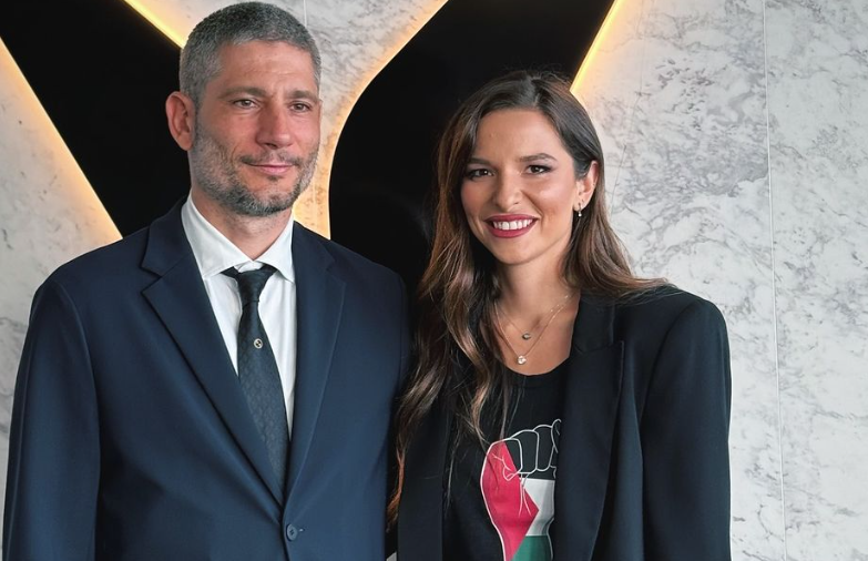 Σε μια νέα σειρά φωτογραφιών με τον σύζυγό της Βύρωνα Βασιλειάδη, που ανέβασε στον λογαριασμό της στο Instagram η ιδρύτρια της φιλοζωικής οργάνωσης Save a Greek Stray, τη βλέπουμε να φοράει μαύρο μπλέιζερ και από μέσα T-shirt που γράφει «Free Palestine».