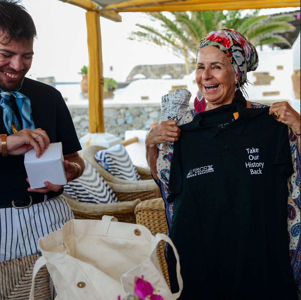 Μαζί με τον υπεύθυνο παραγωγής, κ. Στέλιο Καλογερά, παρέδωσαν στην κυρία Τσοπέη, τα δώρα συμβολικά, που ήταν ένα μπλουζάκι με το σύνθημα TAKE OYR HISTORY BACK, μία κούπα καφέ των Εθνικών Καλλιστείων GS HELLAS και ένα πιστό αντίγραφο του Παρθενώνα, το οποίο συνόδευε το σύνθημά μας.