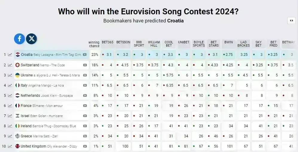 Ωστόσο, εντυπωσιακή ήταν η επάνοδος της Κροατίας στην πρώτη θέση των στοιχημάτων μετά από κάποιες εβδομάδες και το μέχρι πρότινος απόλυτο φαβορί της φετινής Eurovision, Ελβετία, να περνά στη δεύτερη θέση. Η λαμπερή πρόβα της Ουκρανίας την ανέβασε από την 5η στην 3η θέση των προγνωστικών, με την Ιταλία να ακολουθεί τέταρτη και την Ολλανδία να υποχωρεί σημαντικά στην 5η θέση.