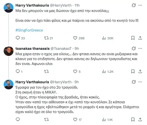 Ωστόσο, ο Χάρης Βαρθακούρης δεν μπόρεσε να απολαύσει την εμφάνιση όπως θα ήθελε, καθώς –όπως δήλωσε– αντιμετώπισε σοβαρό τεχνικό πρόβλημα με τον ήχο της μετάδοσης. Μέσα από ανάρτησή του στο X, εξέφρασε τη δυσαρέσκειά του, σχολιάζοντας πως ο ήχος θύμιζε τηλεφωνική κλήση και όχι επαγγελματική μετάδοση από κονσόλα.