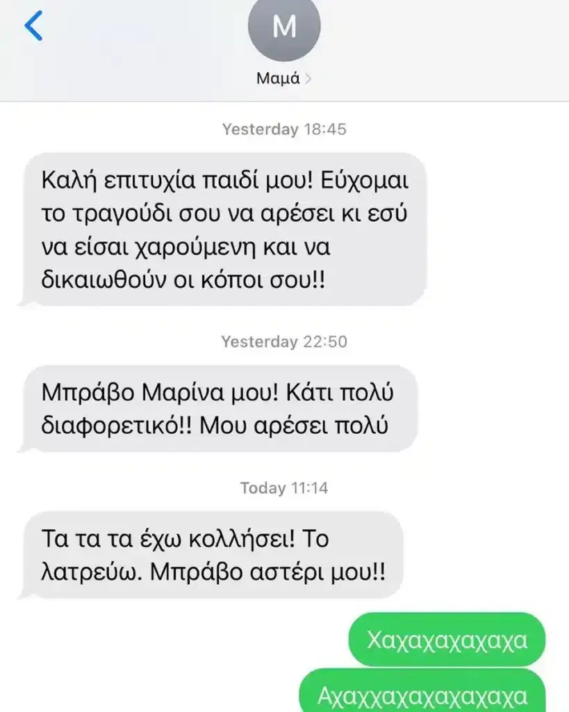 Η Μαρίνα Σάττι μοιράστηκε και στιγμιότυπο από τη συνομιλία της με τη μητέρα της, η οποία της εύχεται τρυφερά «καλή επιτυχία» και να δικαιωθούν οι κόποι της, ενώ σε άλλο μήνυμά, της γράφει ότι το «Ζάρι» είναι πολύ διαφορετικό, και έχει «κολλήσει».