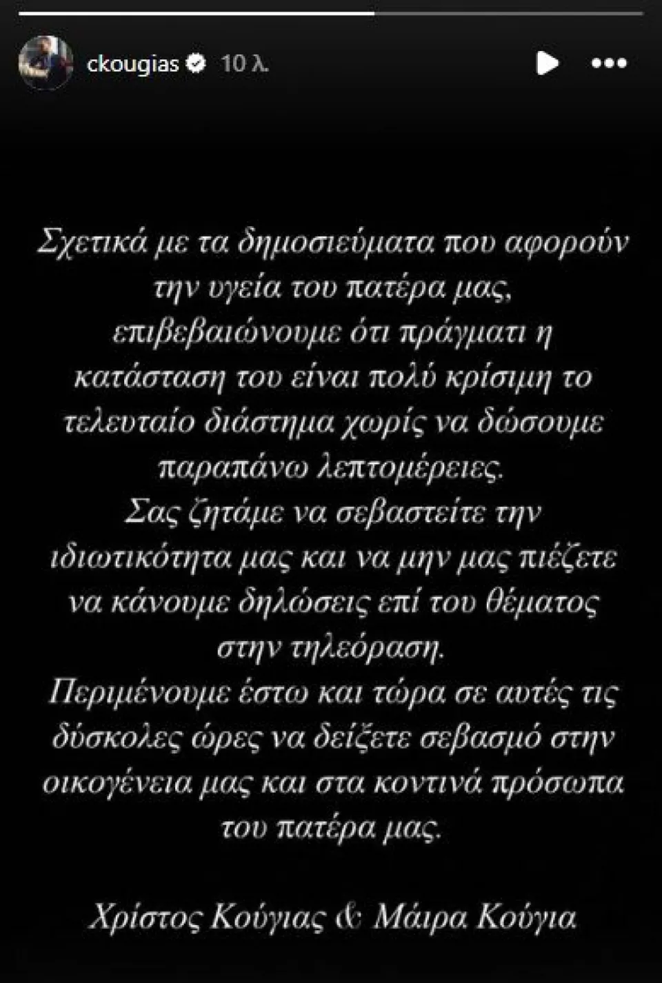 Όπως αναφέρει χαρακτηριστικά σε δήλωση που συνυπογράφει με την αδερφή του, Μάϊρα, o γιος του Χρήστος τονίζει στο Instagram τα εξής: «σχετικά με δημοσιεύματα που αφορούν την υγεία του πατέρα μας, επιβεβαιώνουμε ότι πράγματι η κατάστασή του είναι πολύ κρίσιμη το τελευταίο διάστημα, χωρίς να δώσουμε παραπάνω λεπτομέρειες».