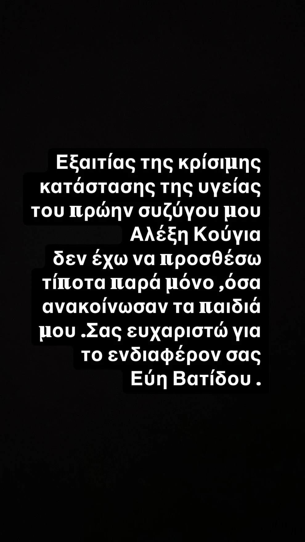 Η πρώην σύζυγός του και μητέρα των παιδιών του Εύη Βατίδου, μέσω των stories του Instagram εξέδωσε μια ανακοίνωση.