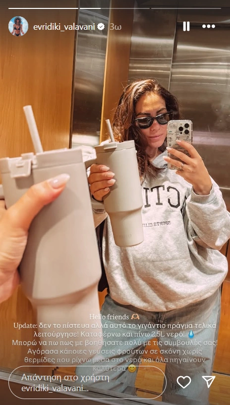 «Hello friends. Update: Δεν το πίστευα αλλά αυτό το γιγαντιαίο πράγμα λειτούργησε! Καταφέρνω και πίνω 2,5 λίτρα νερό. Μπορώ να πω πως με βοηθήσατε πολύ με τις συμβουλές σας. Αγόρασα κάποιες γεύσεις φρούτων σε σκόνη χωρίς θερμίδες που ρίχνω μέσα στο νερό και όλα πηγαίνουν καλύτερα».