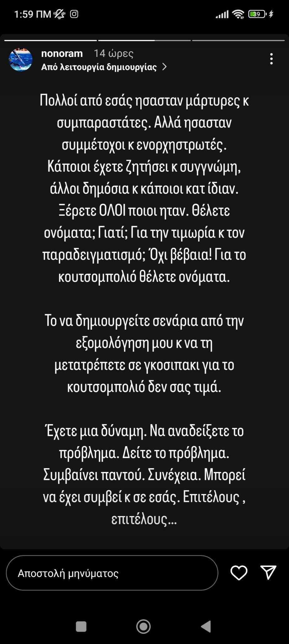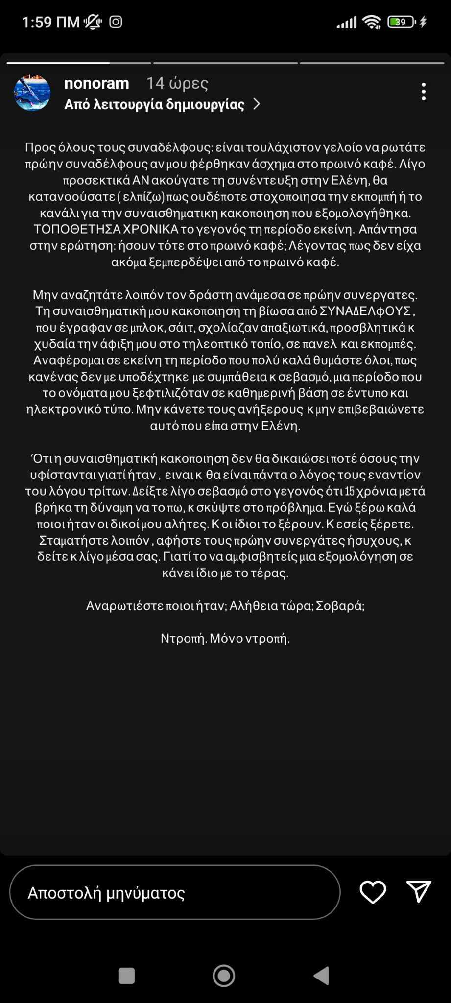 «Προς όλους του συναδέλφους, είναι τουλάχιστον γελοίο να ρωτάτε πρώην συναδέλφους αν μου φέρθηκαν άσχημα στον Πρωινό Καφέ. Λίγο προσεκτικά αν ακούγατε τη συνέντευξή μου στην Ελένη Μενεγάκη θα κατανοούσατε (ελπίζω) πως ουδέποτε στοχοποίησα την εκπομπή ή το κανάλι για τη συναισθηματική κακοποίηση που εξομολογήθηκα.