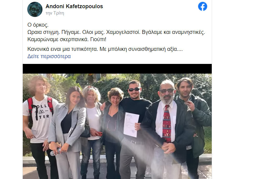 «Ο όρκος. Ωραία στιγμή. Πήγαμε. Όλοι μας. Χαμογελαστοί. Βγάλαμε και αναμνηστικές. Καμαρώναμε σκερπανικά. Γιούπι! Κανονικά είναι μια τυπικότητα. Με μπόλικη συναισθηματική αξία. Παρ’ όλα αυτά, αξίζει να σκεφτείς ότι όταν ορκίζεσαι, το κάνεις για να έχεις μια ανάμνηση στο μέλλον ότι τις γνώσεις που κέρδισες – το πτυχίο είναι η απόδειξη- ο φ ε ί λ ε ι ς να τις χρησιμοποιήσεις με ακεραιότητα. Όχι ως έρμαια αξεσουάρ των όποιων ιδεολογιών. Γιούπι! Γιούπι! Γιούπι!», έγραψε στη λεζάντα ο Αντώνης Καφετζόπουλος.