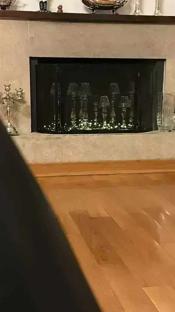 Πολλά κηροπήγια και φωτάκια, δημιουργούν μία cozy γωνιά στο τζάκι. Αν και αγαπά την κλασική διακόσμηση με το ξύλο και τα vintage αντικείμενα να πρωταγωνιστούν, δεν λείπουν οι μοντέρνες πινελιές.
