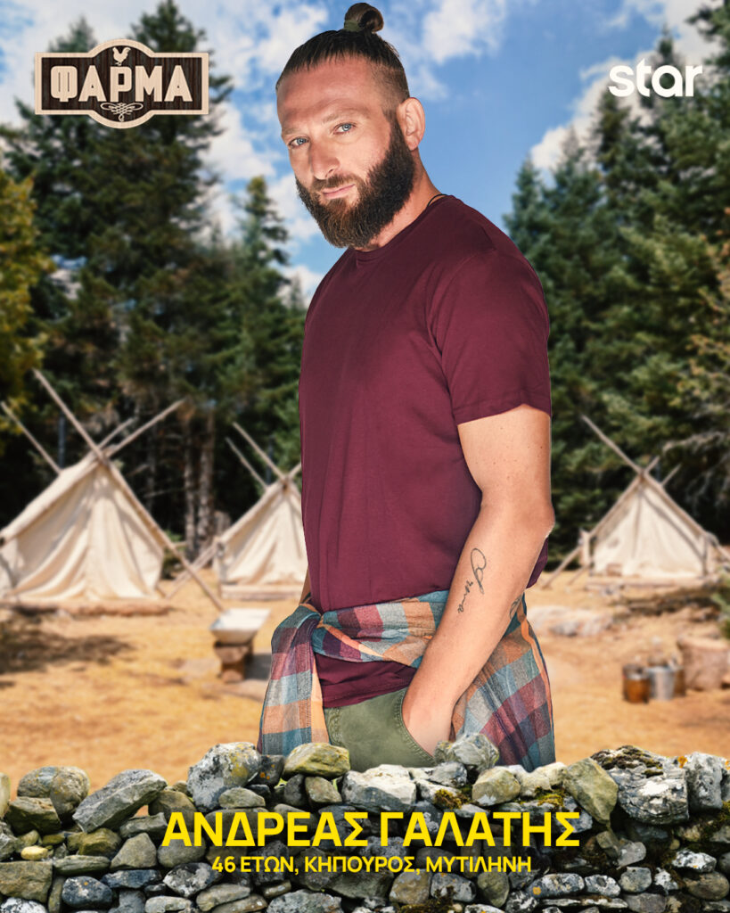Ο Ανδρέας είναι γέννημα θρέμμα Μυτιληνιός και «έχτισε» όλη του τη ζωή στο νησί. Κηπουρός σε θερμοκήπια και χωράφια, αλλά και μάνατζερ στο χώρο της εστίασης, καθημερινά εργάζεται σκληρά για να μη λείψει τίποτα από τη σύζυγο και τις δύο του κόρες. Αυτές είναι και ο λόγος που έρχεται στη Φάρμα με σκοπό τη νίκη. Το μόνο που θα τον δυσκολέψει είναι οι «ψεύτικοι» άνθρωποι, αφού ο ίδιος δεν σκοπεύει να προσποιηθεί και δεν τον ενδιαφέρει να αρέσει σε όλους. Αυτό που τον ενδιαφέρει είναι να κάνει περήφανη την οικογένειά του και να επιστρέψει στο νησί του νικητής! Και είναι σίγουρος ότι μπορεί να τους ανταγωνιστεί όλους «στα ίσα».