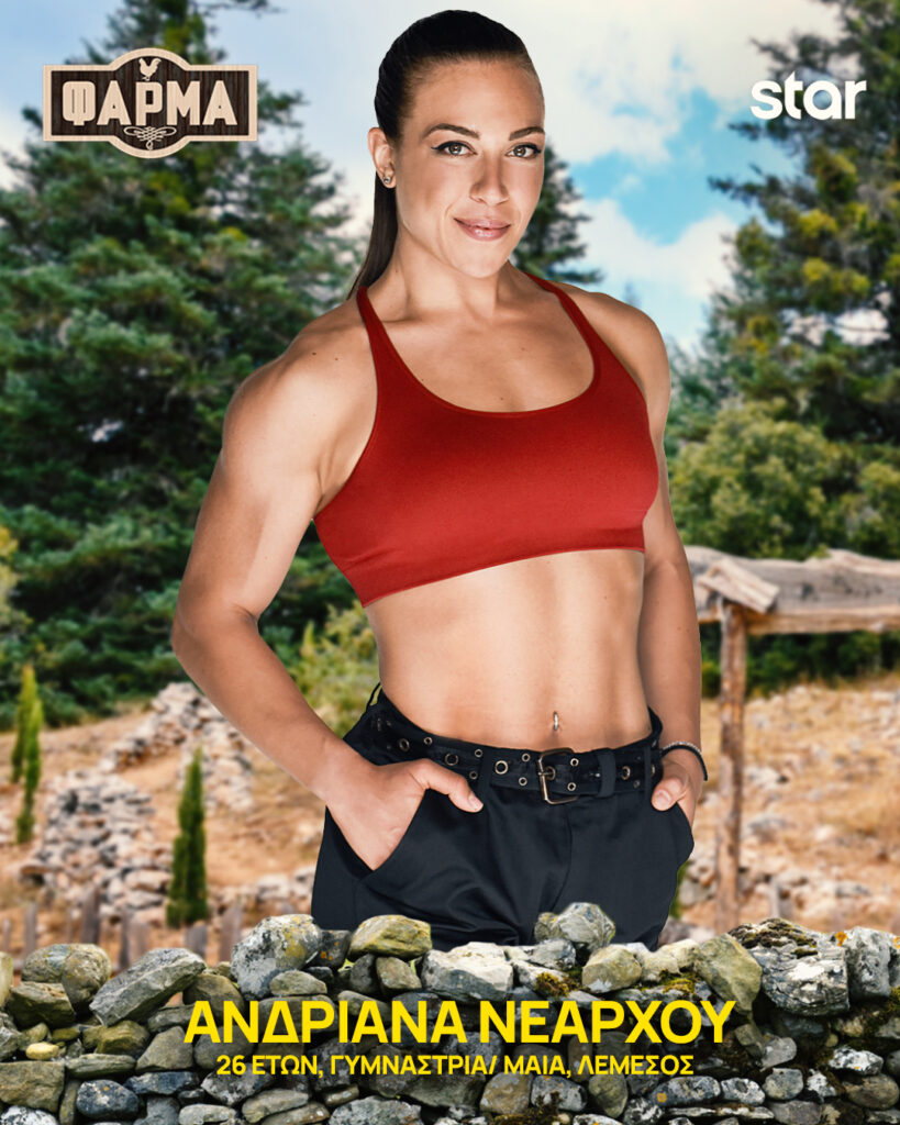 Τι κοινό έχουν η γυμναστική, το bodybuilding και η μαιευτική; Η απάντηση είναι μία: Ανδριάνα Νεάρχου. Με καταγωγή από τη Λεμεσό, η Ανδριάνα έχει μάθει να ζει με πειθαρχία, σκληρή δουλειά και στοχοπροσήλωση. Από την προπόνηση στο γυμναστήριο, στην κλινική και ξανά πίσω, το μόνο πράγμα που της λείπει είναι το κουμπί της παύσης. Δεν τη φοβίζει η ταχύτητα της καθημερινότητας, τη φοβίζει η στασιμότητα. Πίσω από την επιβλητική της εμφάνιση κρύβεται, όμως, μια ευαίσθητη, ευγενική ψυχή, που μπορεί να σηκώνει 100 κιλά στο γυμναστήριο, αλλά θα σκύψει με τρυφερότητα δίπλα σε όποιον την έχει ανάγκη. Στη Φάρμα έρχεται με πυγμή και ατσάλινη θέληση, για να κάνει ακόμη μια μεγάλη υπέρβαση και να στεφθεί νικήτρια.