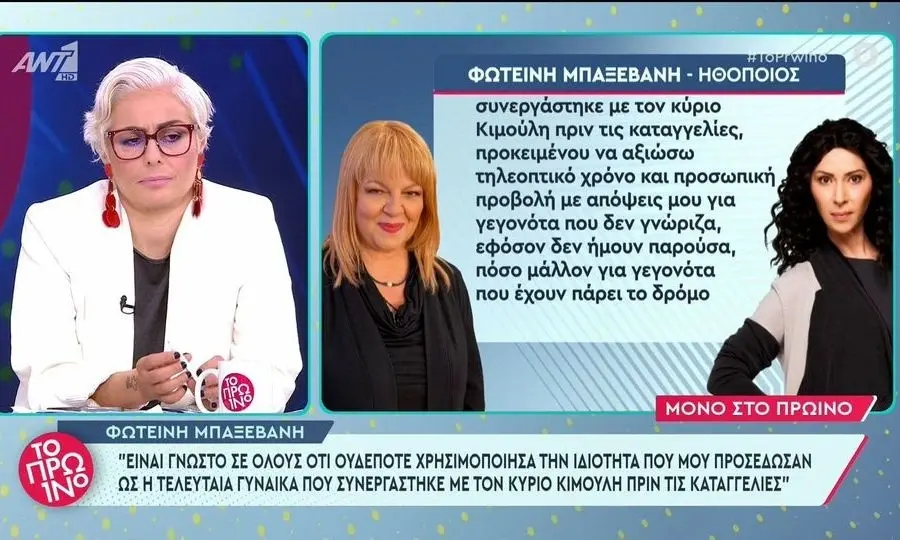 Είναι γνωστό σε όλους ότι ουδέποτε χρησιμοποίησα την ιδιότητα που μου προσέδωσαν ως η τελευταία γυναίκα που συνεργάστηκε με τον κύριο Κιμούλη πριν τις καταγγελίες, προκειμένου να αξιώσω τηλεοπτικό χρόνο και προσωπική προβολή με απόψεις μου για γεγονότα που δεν γνώριζα, εφόσον δεν ήμουν παρούσα, πόσο μάλλον για γεγονότα που έχουν πάρει τον δρόμο της δικαιοσύνης.