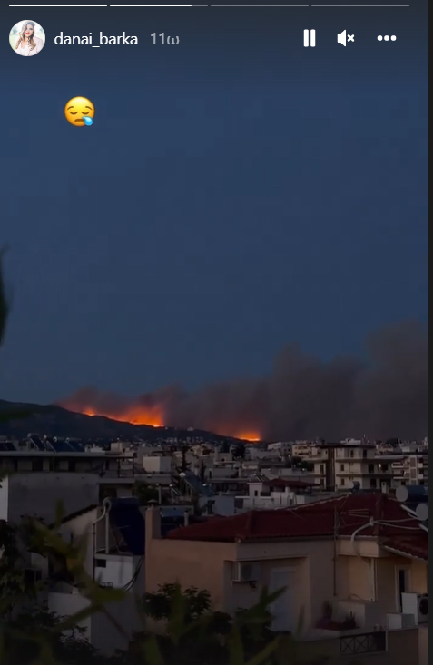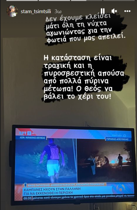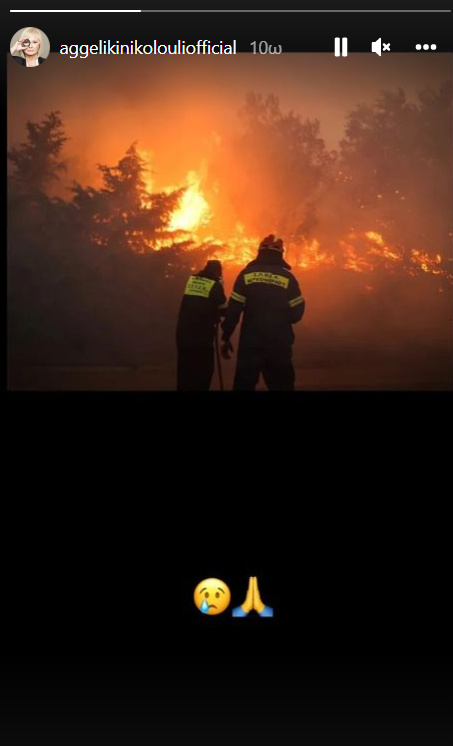 Η Αγγελική Νικολούλη ανέβασε story, στο οποίο απεικονίζονται πυροσβέστες να προσπαθούν να σβήσουν τη φωτιά, βάζοντας μάλιστα ένα λυπημένο εικονίδιο.
