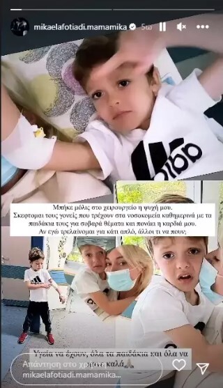Η είδηση έγινε γνωστή από την ίδια τη Μικαέλα Φωτιάδη. Συγκεκριμένα, η πρώην παίκτρια του GNTM δημοσίευσε στα instastories της κάποιες φωτογραφίες με τον γιο της στο νοσοκομείο και έγραψε;