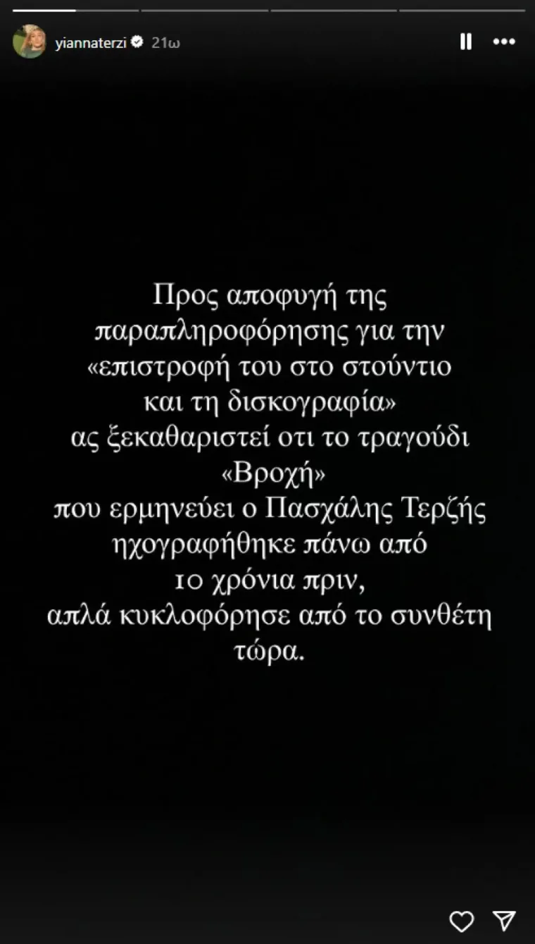 «Ο πατέρας μου δεν επιστρέφει στον χώρο. Το τραγούδι που κυκλοφορεί είχε ηχογραφηθεί πριν από χρόνια, αλλά αποφασίσαμε να το κυκλοφορήσουμε τώρα», έγραψε, η Γιάννα Τερζή.