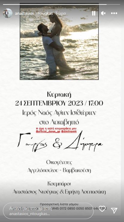 Την χαρμόσυνη είδηση έκανε γνωστή ο δικηγόρος και κουμπάρος τους Αναστάσιος Ντούγκας. Ο δικηγόρος δημοσίευσε το προσκλητήριο του γάμου στο προσωπικό του προφίλ στο instagram.