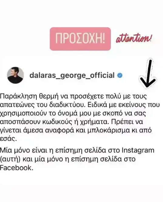 «Παράκληση θέρμη να προσέχετε πολύ με τους απατεώνες του διαδικτύου. Ειδικά με εκείνους που χρησιμοποιούν το όνομά μου με σκοπό να σας αποσπάσουν κωδικούς ή χρήματα. Πρέπει να γίνεται άμεσα αναφορά και μπλοκάρισμα και από εσάς. Μία μόνο είναι η επίσημη σελίδα στο Instagram και μία μόνο η επίσημη σελίδα στο facebook», έγραψε στην ανάρτησή του ο Γιώργος Νταλάρας.