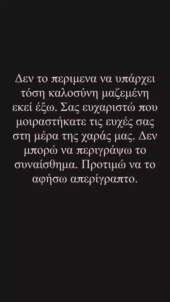 «Δεν το περίμενα να υπάρχει τόση καλοσύνη μαζεμένη εκεί έξω. Σας ευχαριστώ που μοιραστήκατε τις ευχές σας τις ημέρες της χαράς μας. Δε μπορώ να περιγράψω το συναίσθημα. Προτιμώ να το αφήσω απερίγραπτο» έγραψε ο Γιώργος Παπαγεωργίου στην ανάρτηση που έκανε στον προσωπικό του λογαριασμό στο Instagram, θέλοντας να ευχαριστήσει όσους του ευχήθηκαν για τον ερχομό της κόρης του στη ζωή.
