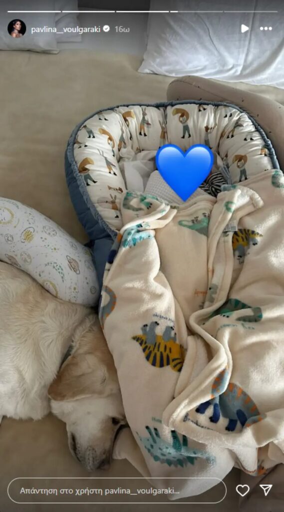 Η ίδια δημοσίευσε ένα στιγμιότυπο όπου φαίνεται ένας σκύλος να κοιμάται στο πλευρό του μωρού.