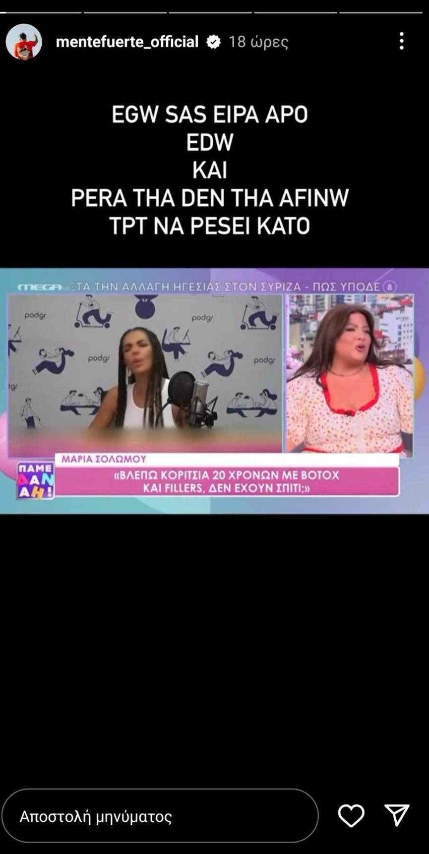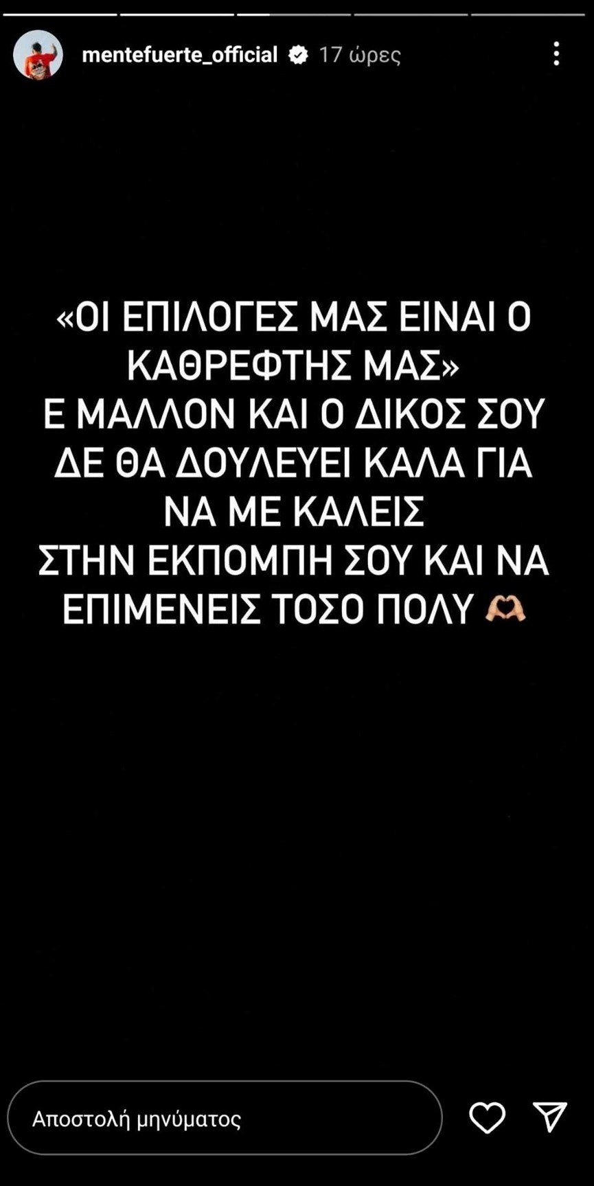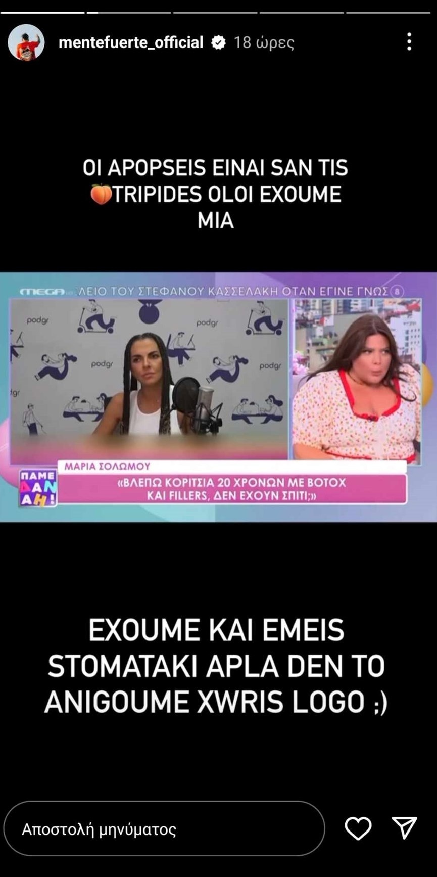 «Εγώ σας είπα, από εδώ και πέρα δεν θα αφήνω τίποτα να πέσει κάτω. Οι απόψεις είναι σαν τις κ@@@ς, όλοι έχουμε από μία. Έχουμε και εμείς στοματάκι, απλά δεν το ανοίγουμε χωρίς λόγο. “Οι επιλογές μας είναι ο καθρέφτης μας”. Ε μάλλον και ο δικός σου δεν θα δουλεύει καλά για να με καλείς στην εκπομπή σου και να επιμένεις τόσο πολύ», έγραψε σε διαδοχικά stories του ο Mente Fuerte.
