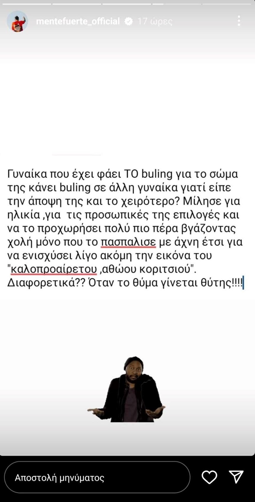 «Γυναίκα που έχει φάει ΤΟ bullying για το σώμα της, κάνει bullying σε άλλη γυναίκα γιατί είπε την άποψή της και το χειρότερο; Μίλησε για ηλικία, για τις προσωπικές της επιλογές και να το προχωρήσει πολύ πιο πέρα, βγάζοντας χολή. Μόνο που το πασπάλισε με άχνη, έτσι για να ενισχύσει λίγο ακόμη την εικόνα “του καλοπροαίρετου, αθώου κοριτσιού”. Διαφορετικά;; Όταν το θύμα γίνεται θύτης», πρόσθεσε σε άλλο story του.