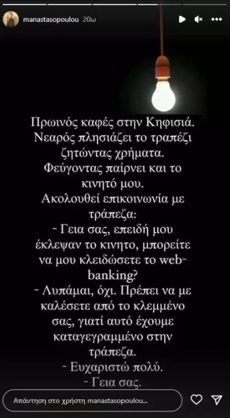 Στο story της, η Μαρία Αναστασοπούλου έγραψε: «Πρωινός καφές στην Κηφισιά. Νεαρός πλησιάζει το τραπέζι ζητώντας χρήματα. Φεύγοντας παίρνει και το κινητό μου. Ακολουθεί επικοινωνία μς την τράπεζα.