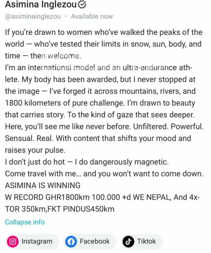 «Είμαι διεθνές μοντέλο και αθλήτρια υπερ-αντοχής. Το σώμα μου έχει βραβευθεί, αλλά ποτέ δεν σταμάτησα στην εικόνα – το έχω διαμορφώσει μέσα από βουνά, ποτάμια και 1800 χιλιόμετρα καθαρής πρόκλησης. Έλκομαι από την ομορφιά που κουβαλάει ιστορία. Από τα βλέμματα που βλέπουν βαθύτερα. Εδώ, θα με δεις όπως ποτέ άλλοτε. Αχρωμάτιστη. Δυναμική. Ευαίσθητη. Αληθινή. Με περιεχόμενο που αλλάζει τη διάθεσή σου και ανεβάζει τον παλμό σου. Δεν κάνω μόνο κάτι “καυτό” – κάνω κάτι επικίνδυνα μαγευτικό. Έλα να ταξιδέψεις μαζί μου… και δεν θα θέλεις να κατέβεις».