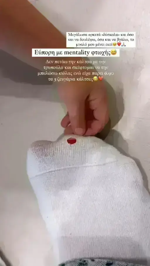 «Μεγάλωσα αρκετά δύσκολα και όσο και να δουλέψω, όσα και να βγάλω, το μυαλό μου μένει εκεί. Εύπορη με mentality φτωχής. Δεν πετάω την κάλτσα με την τρυπούλα και σκέφτομαι να την μπαλώσω κιόλας ενώ είχα πάρει 6,90 τα 3 ζευγάρια κάλτσες», έγραψε χαρακτηριστικά η Ιωάννα Τούνη θέλοντας με αυτόν τον τρόπο να τρολάρει τον εαυτό της.