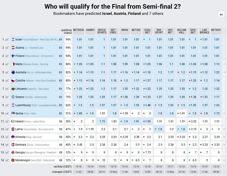 Σύμφωνα με τον πίνακα, που βασίζεται σε συλλογή και ανάλυση αποδόσεων 16 στοιχηματικών εταιρειών από όλο τον κόσμο, η ελληνική συμμετοχή βρίσκεται στην όγδοη θέση -σε απόσταση από την ενδέκατη- στην κατάταξη με τις χώρες του δεύτερου ημιτελικού.