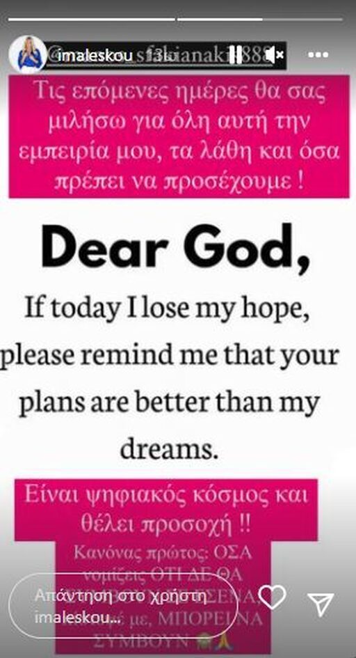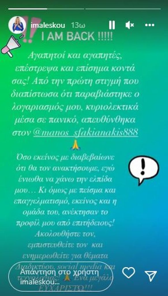 «I am back! Αγαπητοί και αγαπητές επέστρεψε και επίσημα κοντά σας! Από την πρώτη στιγμή που διαπίστωσα ότι παραβιάστηκε ο λογαριασμός μου κυριολεκτικά μέσα σε πανικό απευθύνθηκα στον @manos sfakianakis888 όσο εκείνος με διαβεβαίωνε ότι θα τον ανακτήσουμε εγώ ένιωθα να χάνω την ελπίδα μου.