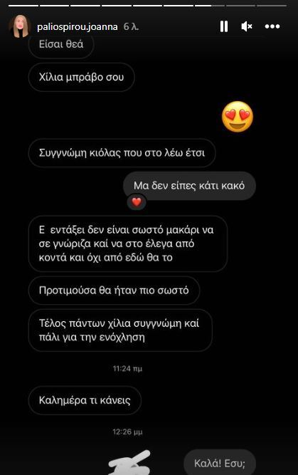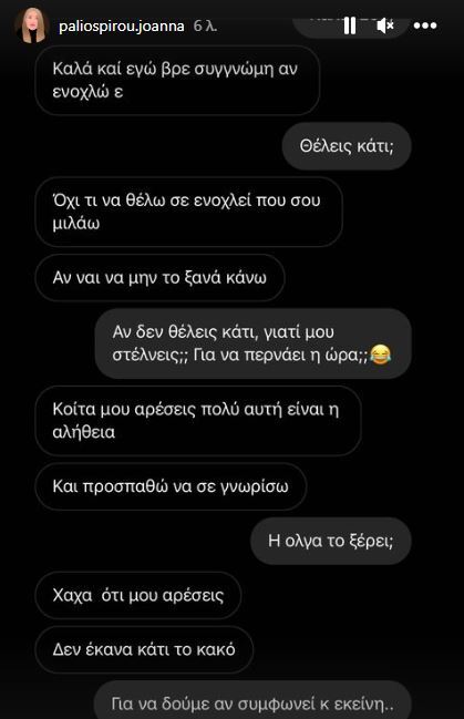 Τότε, η Ιωάννα Παλιοσπύρου τον ρώτησε «Η Όλγα το ξέρει;», αναφερόμενη στη σύζυγό του. «Χαχα, ότι μου αρέσεις; Δεν έκανα κάτι κακό» της απάντησε.
