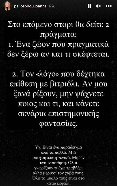 Συγκεκριμένα, το story της γράφει: «Στο επόμενο story θα δείτε 2 πράγματα: 1. Ένα ζώον που πραγματικά δεν ξέρω αν και τι σκέφτεται. 2. Τον “λόγο” που δέχτηκα επίθεση με βιτριόλι. Αν μου ξανά ρίξουν μην ψάχνετε ποιος και τι και κάνετε σενάρια επιστημονικής φαντασίας. Υ.Γ Είναι ένα παράδειγμα από τα πολλά. Μια απογοήτευση γενικά. Όλοι γνωρίζουν τι έχω τραβήξει αλλά μερικοί τον χαβά τους».