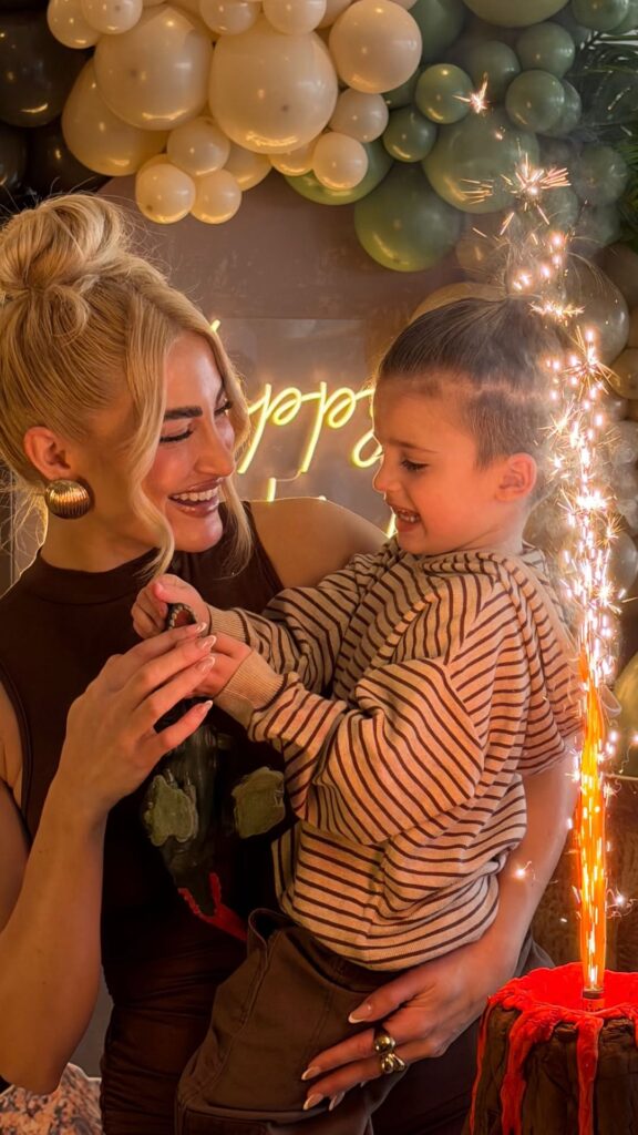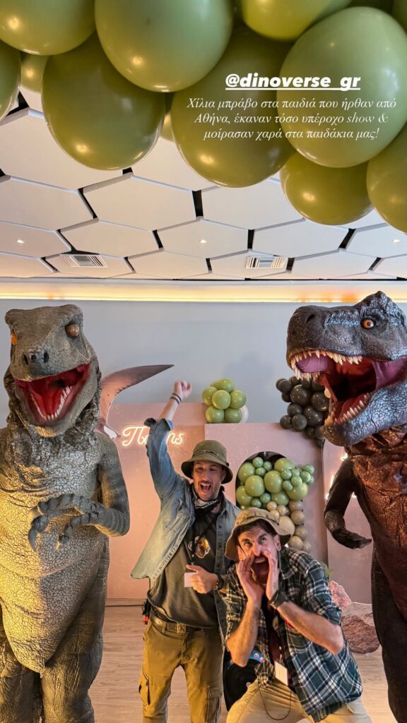 Ο χώρος ήταν διακοσμημένος σε τόνους καφέ, λευκού, μπεζ και πράσινου, με το κεντρικό θέμα να επικεντρώνεται στους δεινόσαυρους. Ξεχωριστή θέση κατείχε η τούρτα σε σχήμα ηφαιστείου, γύρω από την οποία είχαν οργανωθεί παιχνίδια, χειροτεχνίες και δραστηριότητες για τους μικρούς καλεσμένους. Η διοργάνωση περιελάμβανε ακόμη και σόου με ηθοποιούς ντυμένους δεινόσαυρους, προσφέροντας μια διασκεδαστική και ασφαλή εμπειρία για τα παιδιά, ενώ οι γονείς συμμετείχαν ενεργά στα παιχνίδια.
