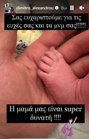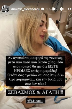 «Αν αγαπούσα μια φορά τις γυναίκες μετά από αυτό που βίωσα χθες μέσα στον τοκετό, θα πω ότι είστε ΗΡΩΙΔΕΣ εσείς οι μαμάδες. Οπότε σας αγαπώ και σας θαυμάζω λίγο παραπάνω… και την δικιά μου όσο δεν πάει! Σεβασμός και αγάπη!!!» έγραψε ο Δημήτρης Αλεξάνδρου.