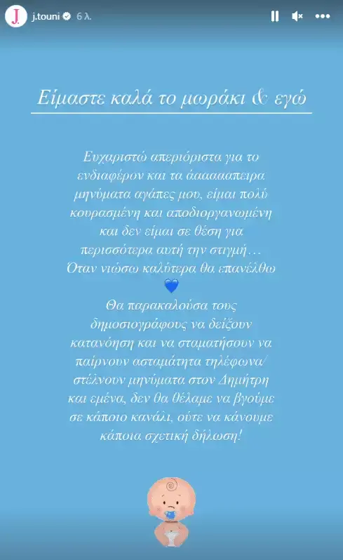 «Είμαστε καλά το μωράκι και εγώ. Ευχαριστώ απεριόριστα για το ενδιαφέρον και τα άπειρα μηνύματα αγάπες μου, είμαι πολύ κουρασμένη και αποδιοργανωμένη και δεν είμαι σε θέση για περισσότερα αυτή τη στιγμή… Όταν νιώσω καλύτερα θα επανέλθω. Θα παρακαλούσα τους δημοσιογράφους να δείξουν κατανόηση και να σταματήσουν να παίρνουν ασταμάτητα τηλέφωνα, στέλνουν μηνύματα στον Δημήτρη και σε μένα, δεν θα θέλαμε να βγούμε σε κάποιο κανάλι, ούτε να κάνουμε κάποια σχετική δήλωση» έγραψε η Ιωάννα Τούνη.