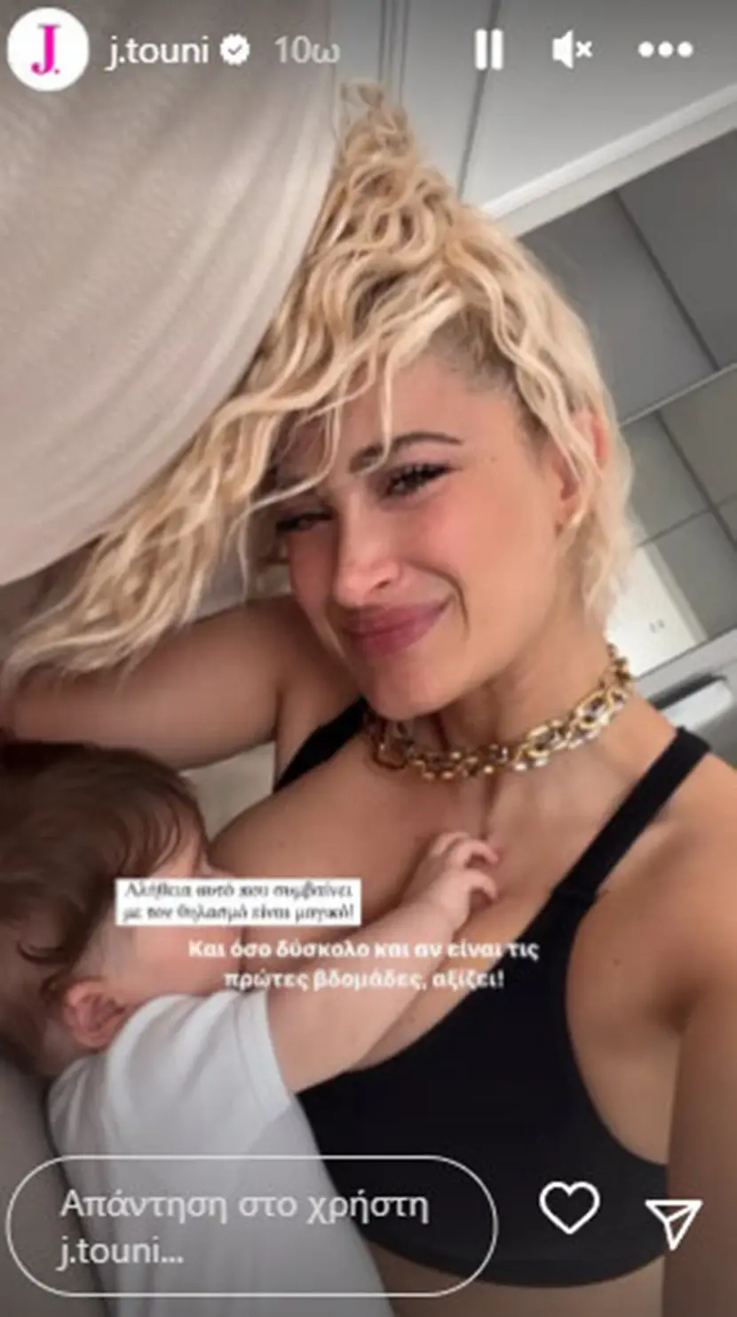 «Αυτό που συμβαίνει με τον θηλασμό είναι μαγικό», έγραψε στη πρώτη φωτογραφία, ενώ στη δεύτερη σημείωσε το εξής: «Παλεύει μόνος του. Άκου τσιρίδα».