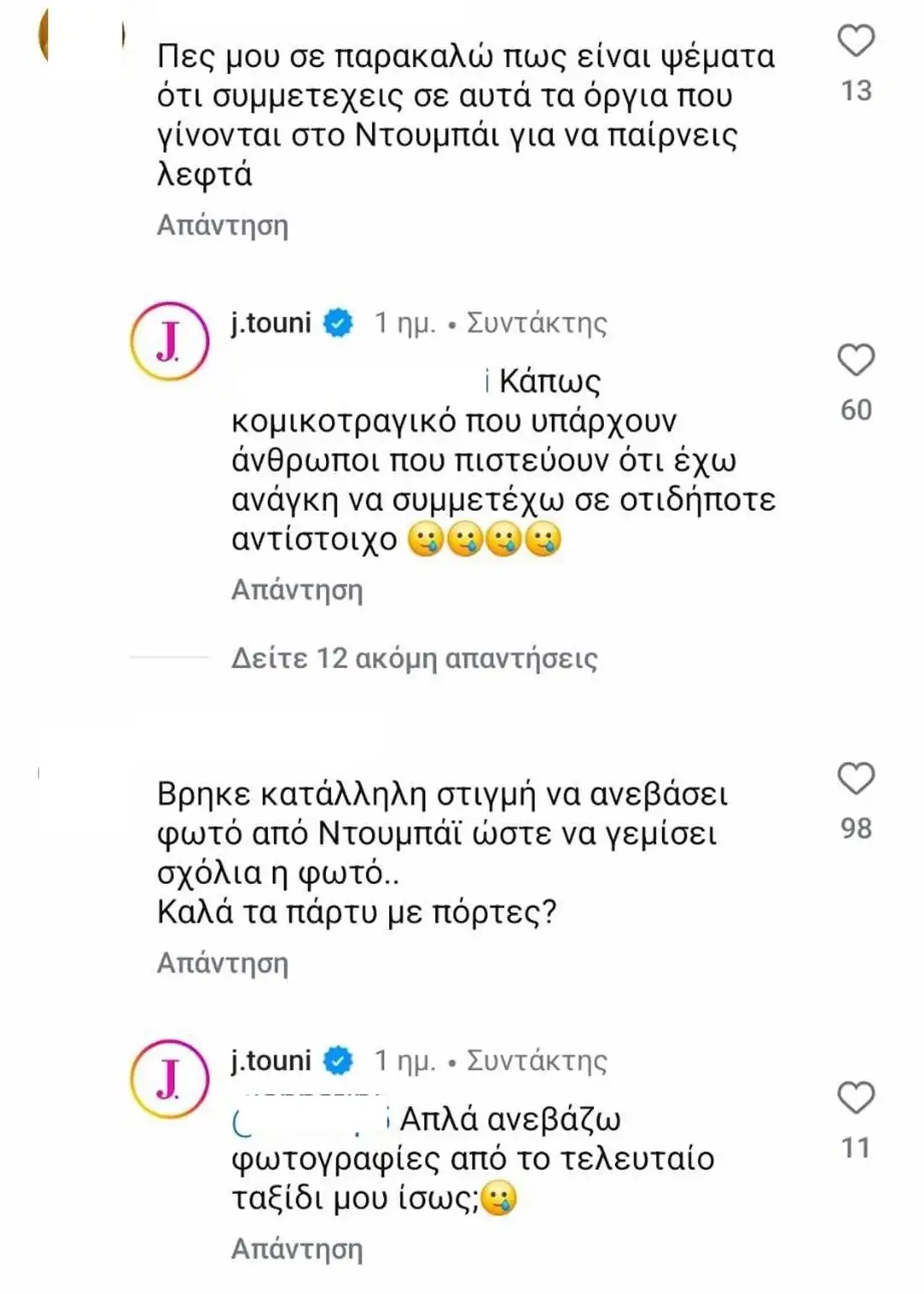 «Πες μου σε παρακαλώ πως είναι ψέματα ότι συμμετέχεις σε αυτά τα όργια που γίνονται στο Ντουμπάι για να παίρνεις λεφτά» έγραψε follower στην Ιωάννα Τούνη.