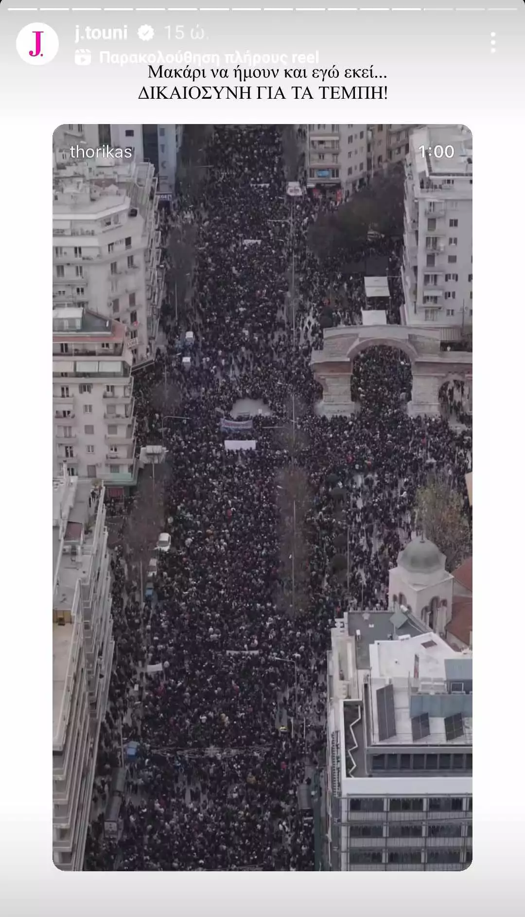 Μετά τις έντονες αντιδράσεις και τα δεκάδες αρνητικά σχόλια, η Ιωάννα Τούνη έκανε και Instagram Story για τα Τέμπη, γράφοντας χαρακτηριστικά: «Μακάρι να ήμουν και εγώ εκεί… Δικαιοσύνη για τα Τέμπη».