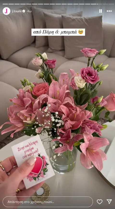 Η Ιωάννα Τούνη έλαβε ένα εντυπωσιακό μπουκέτο με ροζ λουλούδια με την κάρτα «Στην καλύτερη μητέρα του κόσμου».