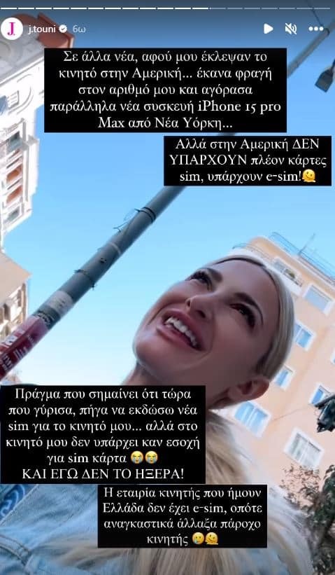 «Σε άλλα νέα αφού μου έκλεψαν το κινητό στην Αμερική… έκανα φραγή στον αριθμό μου και αγόρασα νέα συσκευή από Νέα Υόρκη. Αλλά στην Αμερική δεν υπάρχουν πλέον κάρτες sim αλλά e-sim. Πράγμα που σημαίνει ότι τώρα που γύρισα, πήγα να εκδώσω νέα sim για το κινητό μου… αλλά στο κινητό μου δεν υπάρχει καν εσοχή για sim κάρτα. Και εγώ δεν το ήξερα! Μια τεράστια ταλαιπωρία με αυτό το κινητό στην Αμερική. Sorry σε όσους με ψάχνουν εδώ και μέρες» ανέφερε η Ιωάννα Τούνη στα Instagram Stories της.